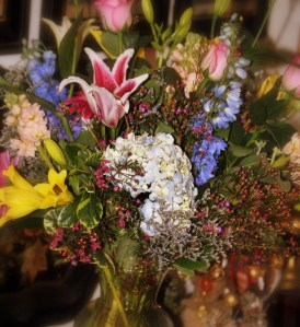 As I was waiting for my sweet man so we could have dinner with his father, there was a knock at the door – a florist standing there with a GIANT flower arrangement. I asked him if he was sure he had the right address. He did.