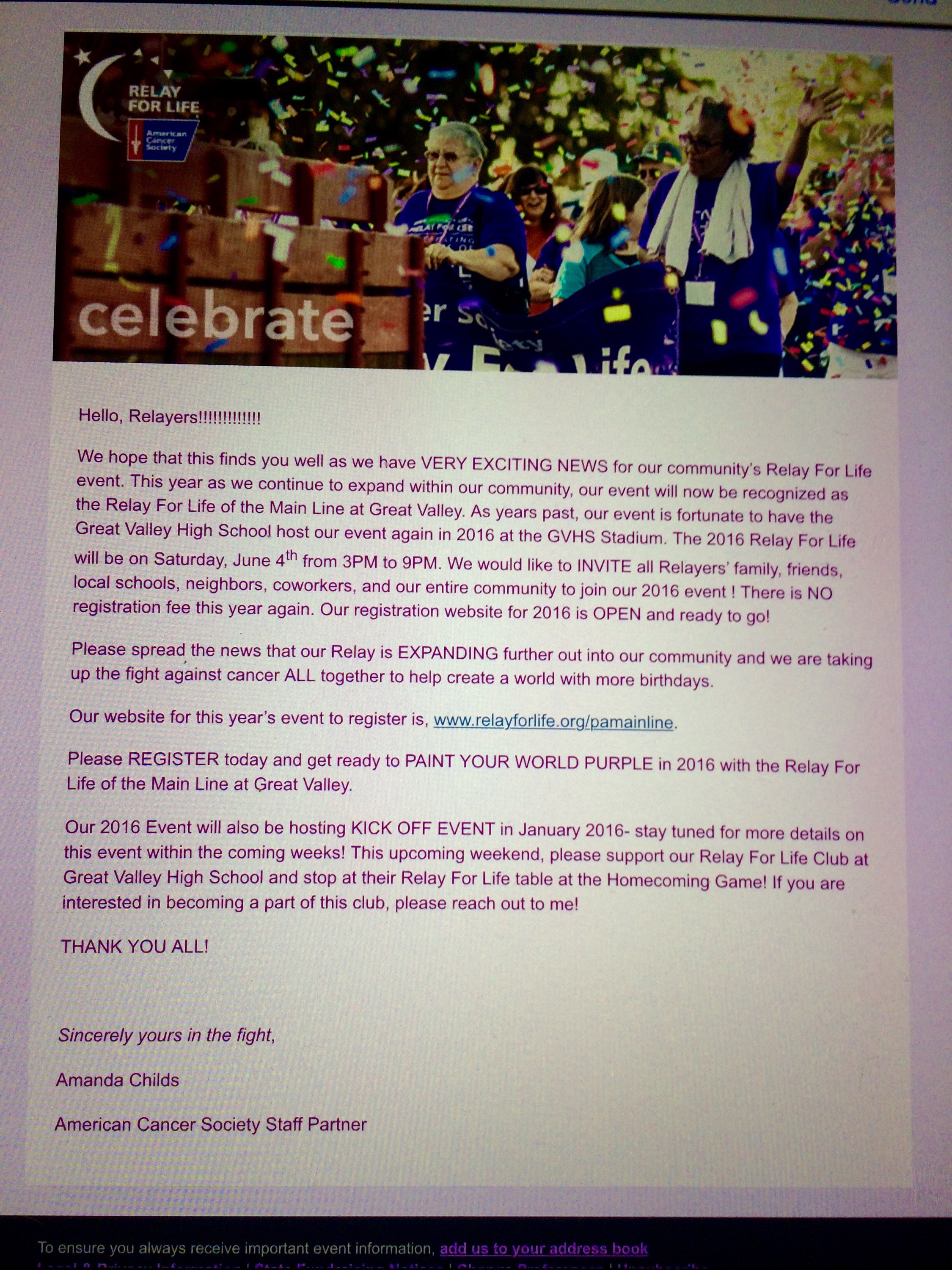 This is actually enough to make me lose interest in the event. If the American Cancer Society can’t be proud that part of their event is held in Chester County at Great Valley High School, why on earth would I want to participate ? It’s like the American Cancer Society is ashamed to say they hold part of this nationwide event in Chester County.