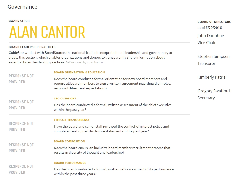 So maybe it is just me, but sometime if it walks like a duck and quacks like a duck, well it’s a duck. And for a non-profit, I did not find what GuideStar had to say a ringing endorsement. And the corporate governance stuff I found troubling.
