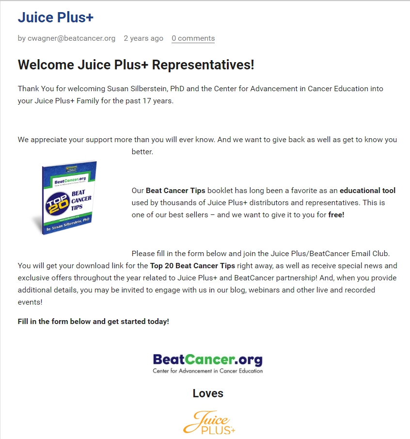 So don’t take my word for it, do your own research.  The Center for Advancement in Cancer Education AKA BeatCancer.org and Juice Plus do not pass the smell test with me.