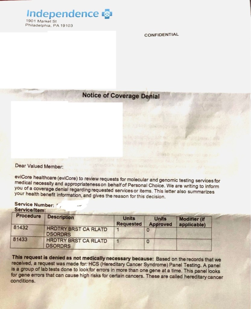 Independence Blue Cross has denied my genetic testing related to breast, cancer and other cancers.