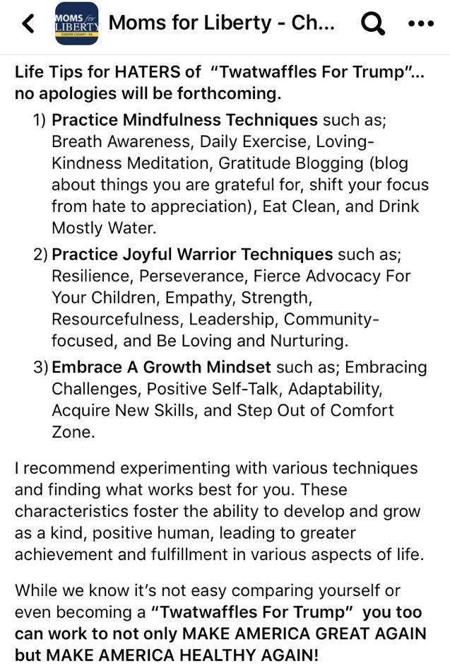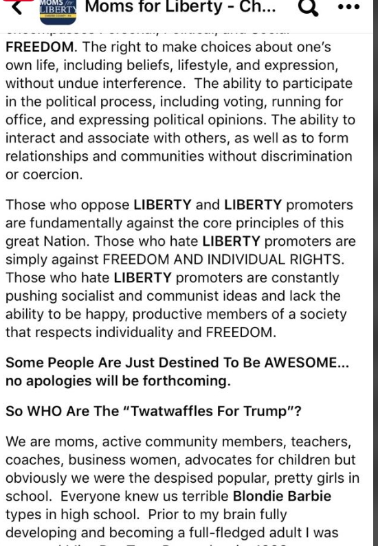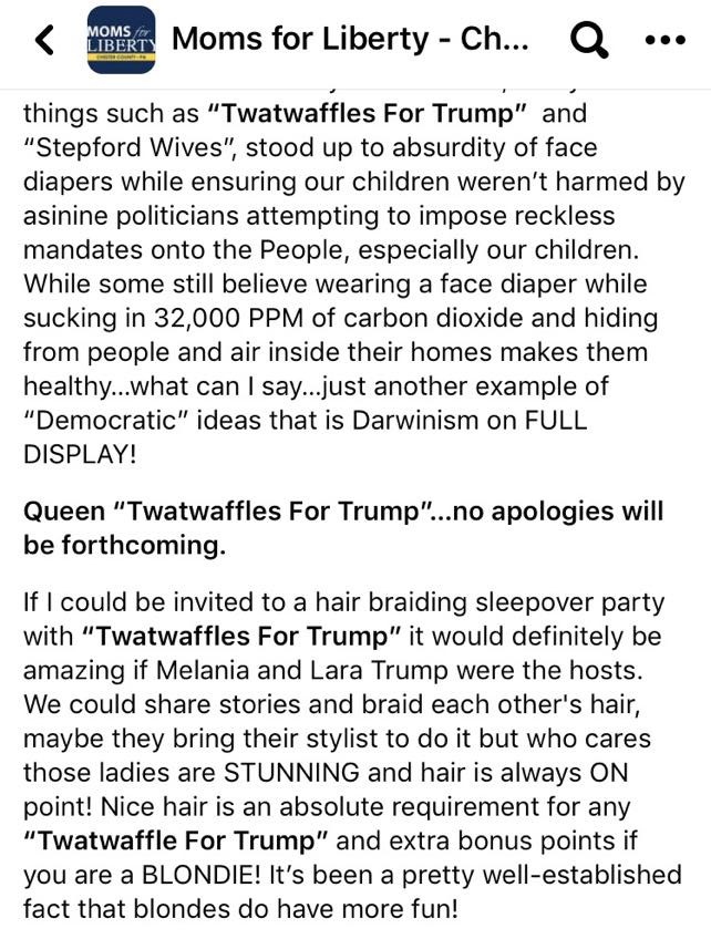 Anyway, this group I refer to as Twatwaffles for Trump are actually Moms for Liberty and Moms for America is just another (earlier and older including age-wise) version. Stepford Wives for Totalitarianism, the worst kind of group think, essentially a loud obnoxious cult. Where I live, they don’t like me. Why is one woman (me) such a threat? I don’t even think about their ridiculousness unless they shove it in my face and once again blame me for the end of humanity. And for what? Simply because I think they are absurd people?