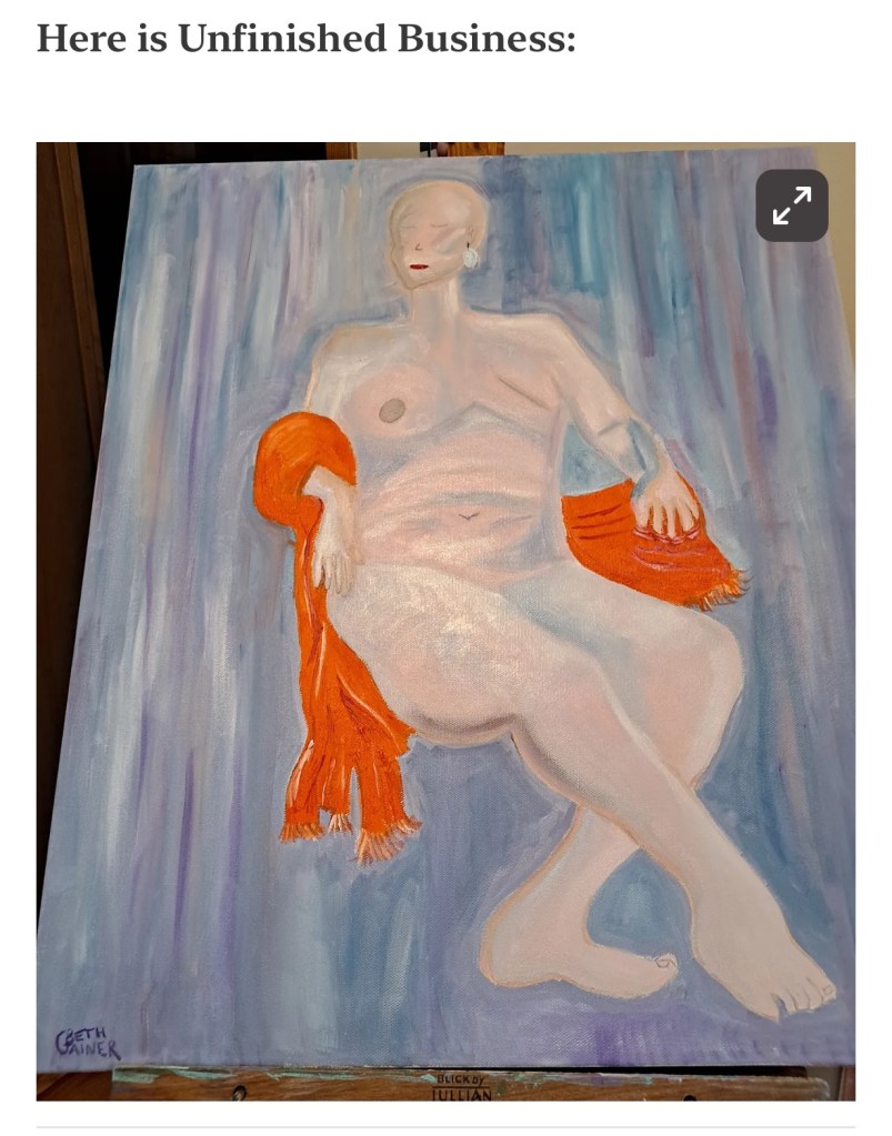 So artist Beth Gainer’s post and her particular painting opening her post resonates with me. I look at that painting and I see myself or a part of myself. Now I still have half a breast on the left, which is more than you see in the painting, but that’s how you feel. And I’m not saying that because it’s good or it’s bad because it’s neither, it just is.