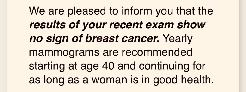 Because of the bizarro world of when insurance allows you to schedule your mammogram and when your hospital system has availability, I didn’t get my annual screening until July 3rd.