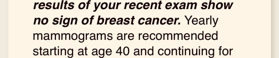 I was taken in and had my mammogram and the tech as always was so nice. When I came back into the dressing room/waiting area there was a woman younger than all of us who was just beginning the journey of she didn’t know what her diagnosis was yet. Up until that point I think I had been the only actual breast cancer/cancer survivor/patient.
