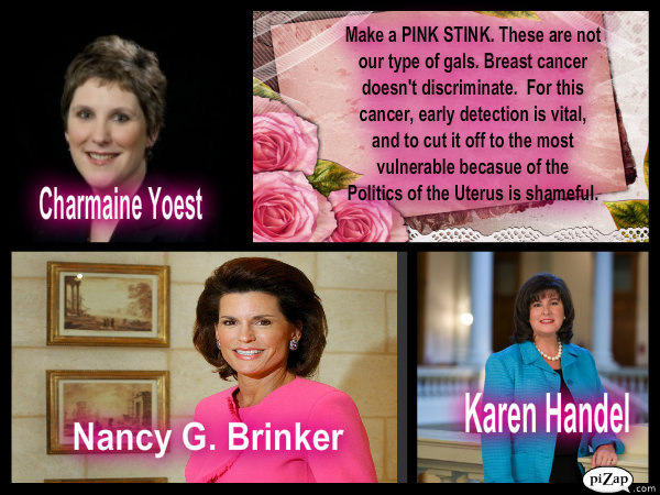 Politics has NO place in women’s health. I do not need people who are politicians dictating their ideological preferences at the expense of MY health as a woman and limiting any choice under the sun I might need – after all health insurance in this country kinda sorta already does that. And the 411 although none of anyone’s business, I say this as both a Catholic and a Republican. So maybe I am going to hell, but I will do so as a breast cancer survivor who is not afraid to speak her mind or look her God in the eye.